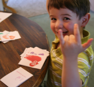 I tied sets of them up and put them inside these little heart pockets I made. There's a pocket for all six of us so that Cooper and Ry can give us all little notes! The cards are made to be folded in half so that he can have room to practice the letter from the front or write and draw what he likes. He caught on instantly when he saw the letters!