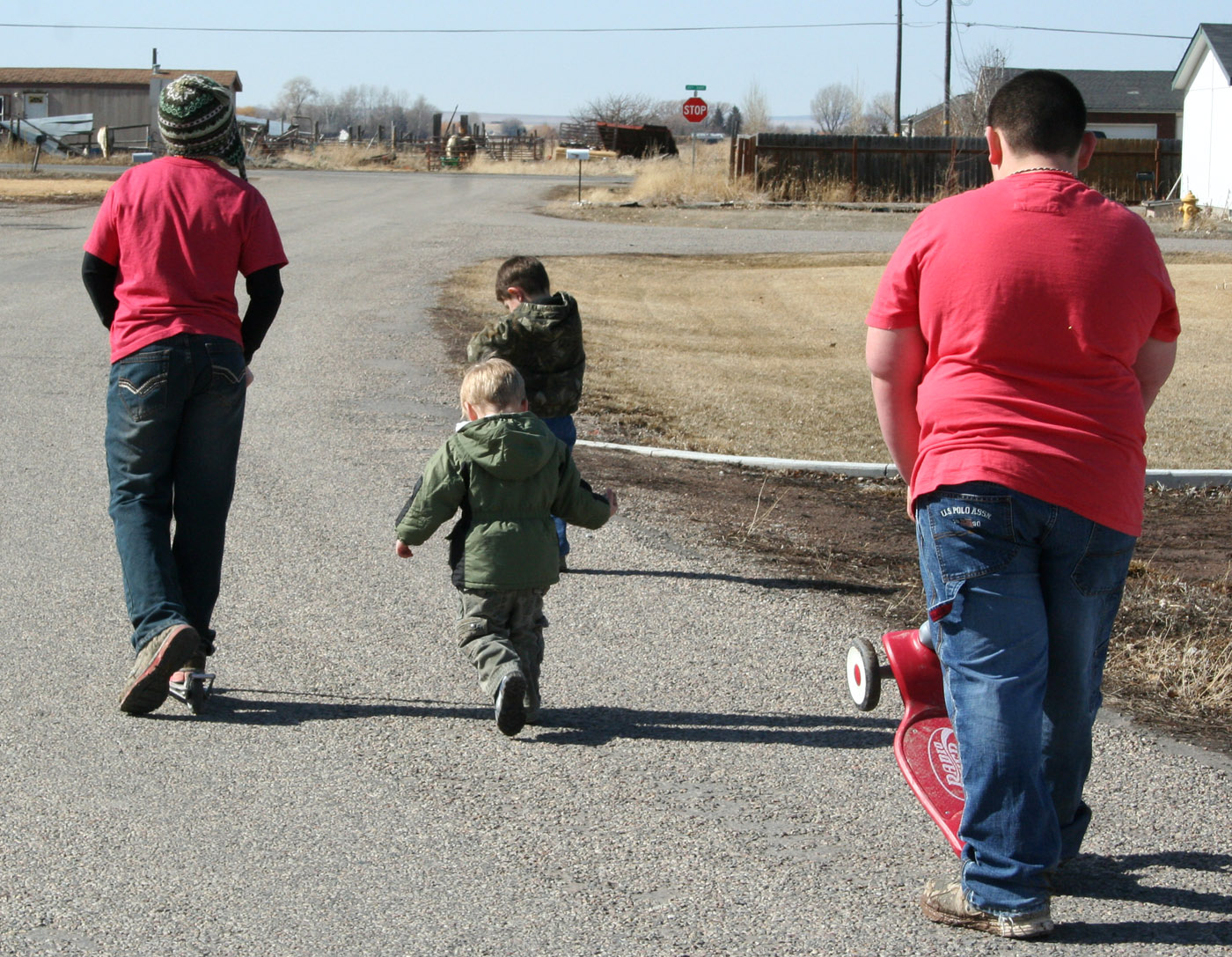 The older boys didn't have school Monday, so we got to have them an extra day! It was finally nice out and we all went on a walk up the street. As always, Coop and Ry wanted their scooters, but abandon them just a few houses down... usually I'm stuck dragging them both on each side, but the older boys got a ride in too after all this time :)