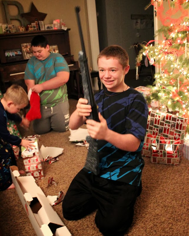 We had given the boys each a Nerf gun and the gotten ourselves an even bigger version so we could have some sweet battles! Very last thing on Christmas Eve we realized we'd gotten the wrong size batteries for our larger guns... so the battle waited until Christmas night, then we all strapped flashlights to our guns or put on headlamps and turned out all the lights in the house for a really fun battle! I'll be finding little blue foam bullets around the house for the rest of my life I daresay!